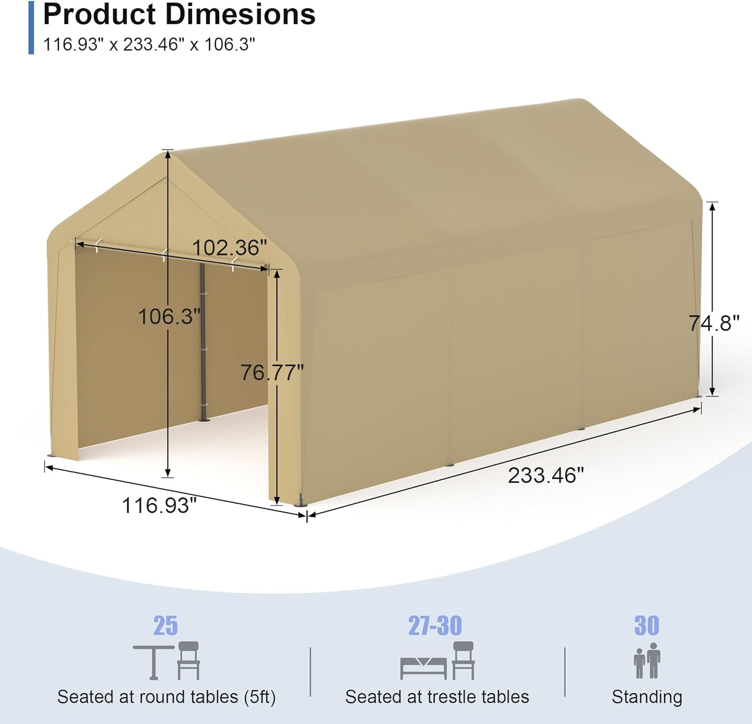 - 【Large Capacity Carport】The 10 x 20 FT canopy tent provides ample space for parking your car, truck, or boat. The triangular metal structure enhances the stability of the portable garage and comes with nylon ropes and ground nails to withstand strong winds.