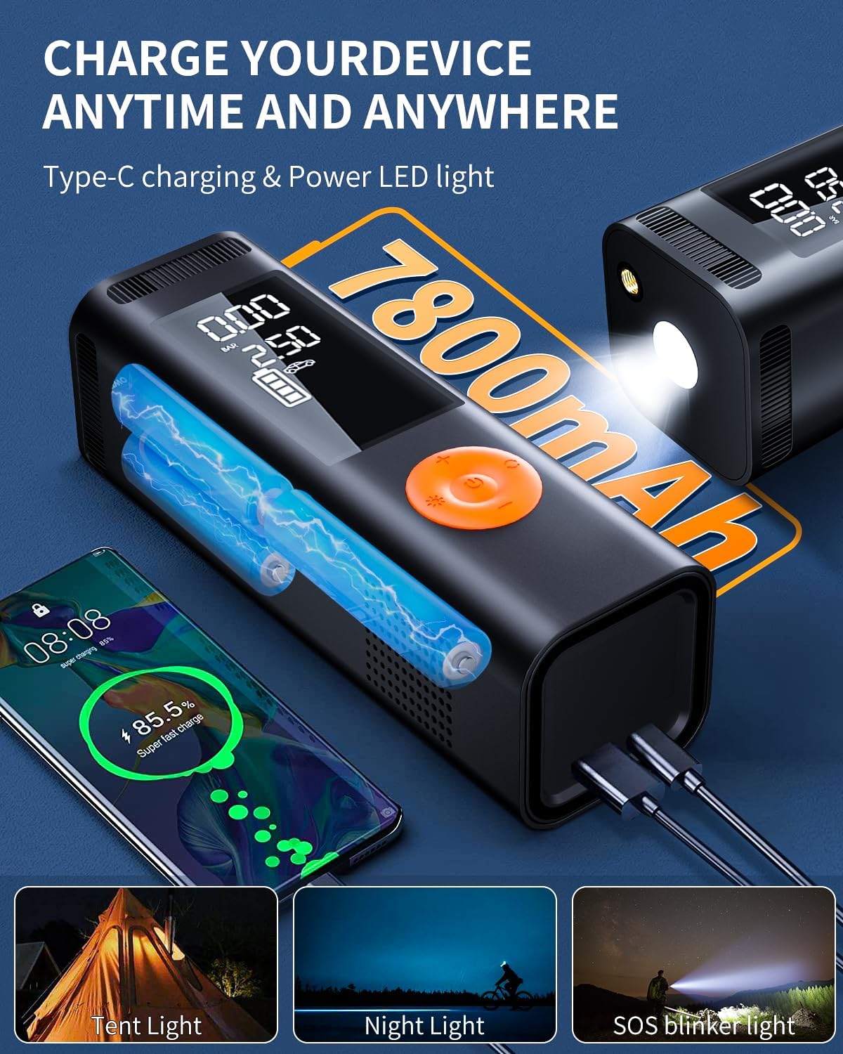 - [Fast Charge Smart Air Pump] Portable air pump 7800mAh high-multiplier battery, quickly inflates up to 4 car tires on a full charge, car tire inflator is equipped with LED on the top to make sure you can inflate easily in the dark. USB port on the bottom can be used as a mobile power supply