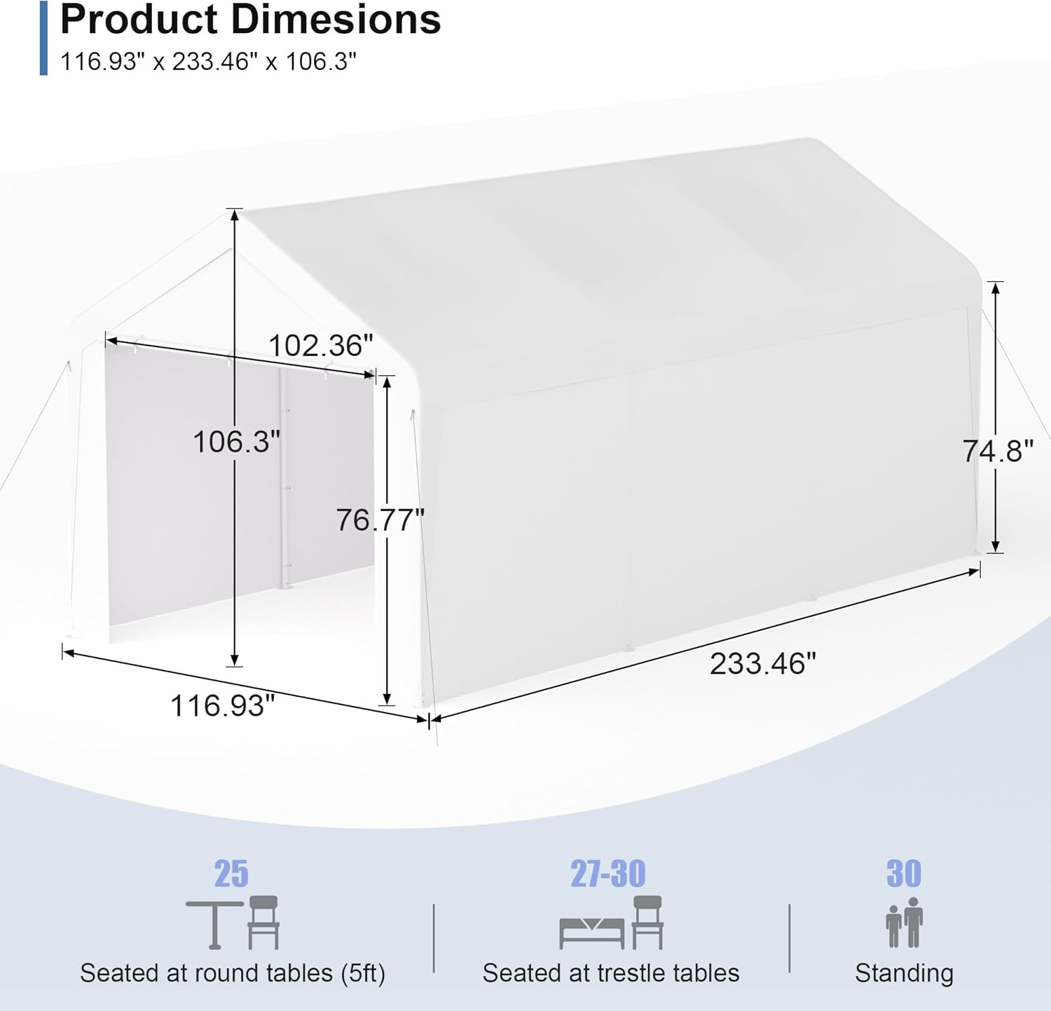 - 【Large Capacity Carport】The 10 x 20 FT canopy tent provides ample space for parking your car, truck, or boat. The triangular metal structure enhances the stability of the portable garage and comes with nylon ropes and ground nails to withstand strong winds.